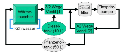Nachdem das Kühlwasser 80°C erreicht, wird durch Ventil 1 auf Pflanzenölbetrieb umgeschaltet. Das Pflanzenöl fließt durch den 80°C heißen Wärmetauscher und Ventil 1 in den Dieselfilter. Über die Einspritzpumpe und das zeitverzögerte umgeschaltete Ventil 2 fließt das überschüssige Pflanzenöl in den Pflanzenöltank zurück. Eine Überhitzung des Pflanzenöls ist ausgeschlossen. Das Kühlwasser wird durch das Motorsystem konstant auf 80° gehalten.